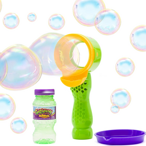 Convierte cualquier día soleado en una burbuja espectacular con la varita de burbujas Gazillion Vortex Premium. Deslice la varita en la bandeja de llenado, presione el gatillo de fácil alcance y vea un ventilador sin aspas desatar un túnel giratorio de burbujas gigantes y brillantes. La solución Gazillion de 4.0 fl oz incluida ofrece burbujas superfuertes probadas en laboratorio que duran más tiempo en el aire, mientras que el diseño portátil alimentado por batería permite a los niños de 3 años o más vagar sin cables ni bombas. Perfecto para cumpleaños, barbacoas y aventuras diarias al aire libre: solo tienes que añadir dos pilas AA y dejar que comience la magia de burbujas.