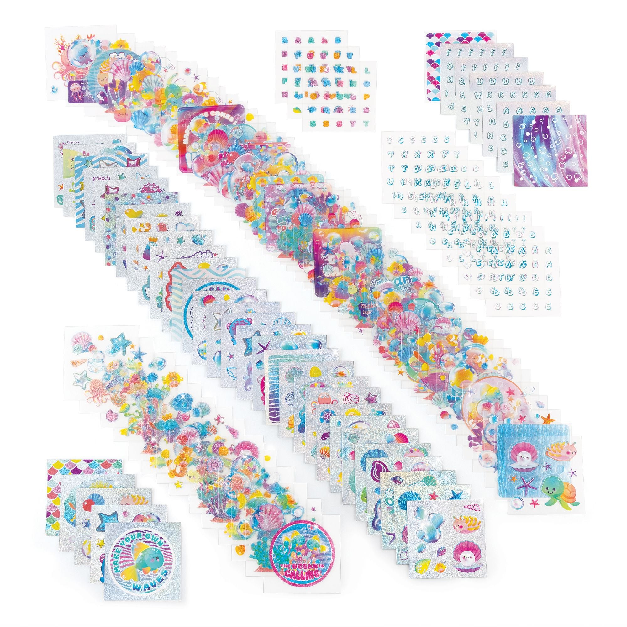 Juego de calcomanías de fantasía acuática - Sumérgete en una fantasía submarina con 120 hojas de calcomanías de temática acuática. ¿Quién no está obsesionado con las pegatinas en este momento? Disfruta de más de 1000 calcomanías coloridas con láminas holográficas y acabados de purpurina, perfectas para decorar diarios, manualidades y cualquier proyecto que necesite un toque de diversión inspirada en el océano. Sumérgete en el mundo mágico de divertidos peces, conchas marinas y criaturas marinas para dar vida a tus creaciones. Deja que tu imaginación fluya mientras mezclas y combinas diseños para crear tus propias escenas submarinas únicas. Ya sea que estés personalizando cuadernos o intercambiando con amigos, ¡las posibilidades son infinitas! Este juego es la idea de regalo perfecta para los preadolescentes de moda, ya sea para unas vacaciones, cumpleaños o simplemente porque sí. Comparte la diversión junto al mar con amigos o añádelo a cualquier colección de calcomanías para un bonito toque de estilo acuático. Fomenta la autoexpresión y la creatividad en los decoradores jóvenes con este juego de calcomanías de moda. Perfecto para niñas, niños y preadolescentes a partir de 6 años. INCLUYE: 120 hojas de pegatinas.