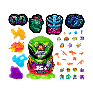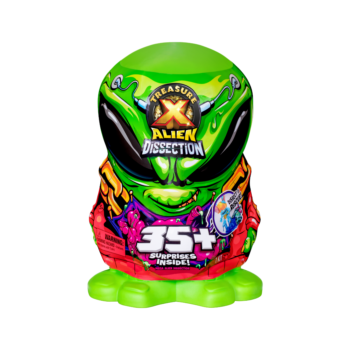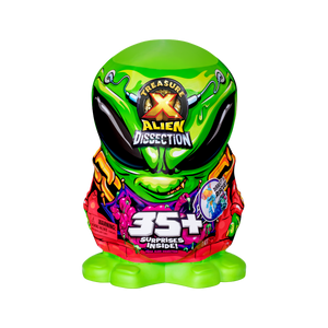 ¡Presentamos la NUEVA Disección Mega Alien de Treasure X, que cuenta con un mega 35+ sorpresas en su interior! Cuando los niños presenten al colosal alienígena de 30,48 cm (12 pulgadas) de altura, se embarcarán en un viaje de desembalaje que está realmente fuera de este mundo. Los niños descubrirán 4 de los órganos del alienígena, incluidos el corazón, los globos oculares, las tripas y el cerebro. ¡Disecciona cada órgano para desenterrar a los cazadores de tesoros alienígenas encerrados en diferentes compuestos exudados, blandos y elásticos! ¡Rescátalos de la sustancia pegajosa galáctica e intercambia las partes del cuerpo del cazador para crear figuras alienígenas únicas! ¡Equipa a los cazadores de alienígenas con 9 armas y accesorios diferentes para que puedan defender la galaxia! ¡También incluye 7 pegatinas alienígenas geniales! ¿Encontrarás los 4 tesoros cósmicos, incluido el verdadero tesoro sumergido en oro?