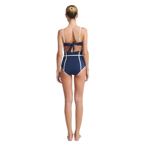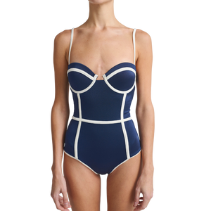 Enterizo con copa fija y silueta icónica de Ancora. Cuenta con sesgos estratégicamente ubicados que estilizan la figura, tirantes ajustables con tensores en acabado de baño de oro.