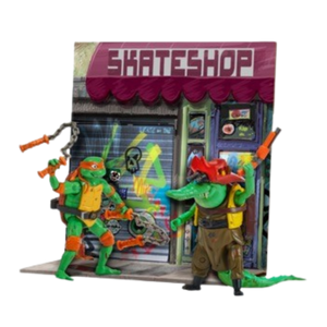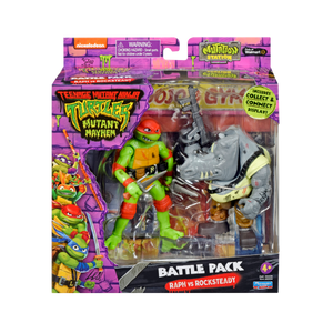 Preparémonos para retumbar con el paquete de dos Teenage Mutant Ninja Turtles Raphael contra Rocksteady. Cada figura está muy detallada y decorada con cortes, cicatrices y moretones de la batalla. Las figuras de 4'' vienen empaquetadas en un paquete de caja de ventana que incluye un diorama de fondo muy detallado e ilustrado a color sobre el que las figuraspueden pararse.