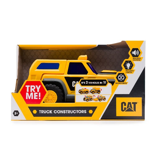 CAT Vehículo de Construcción Truck Constructors Ahora los más pequeños podrán obtener su vehículo de construcción CAT. Fundidos en plástico con alto nivel, un producto 100% ORIGINAL. En este caso en su versión equipo de acción. 2 MODELOS: Camión con volquete / Camión con pala cargadora. Miden 25 cm. aproximadamente. Con luces, sonidos y transformables.
