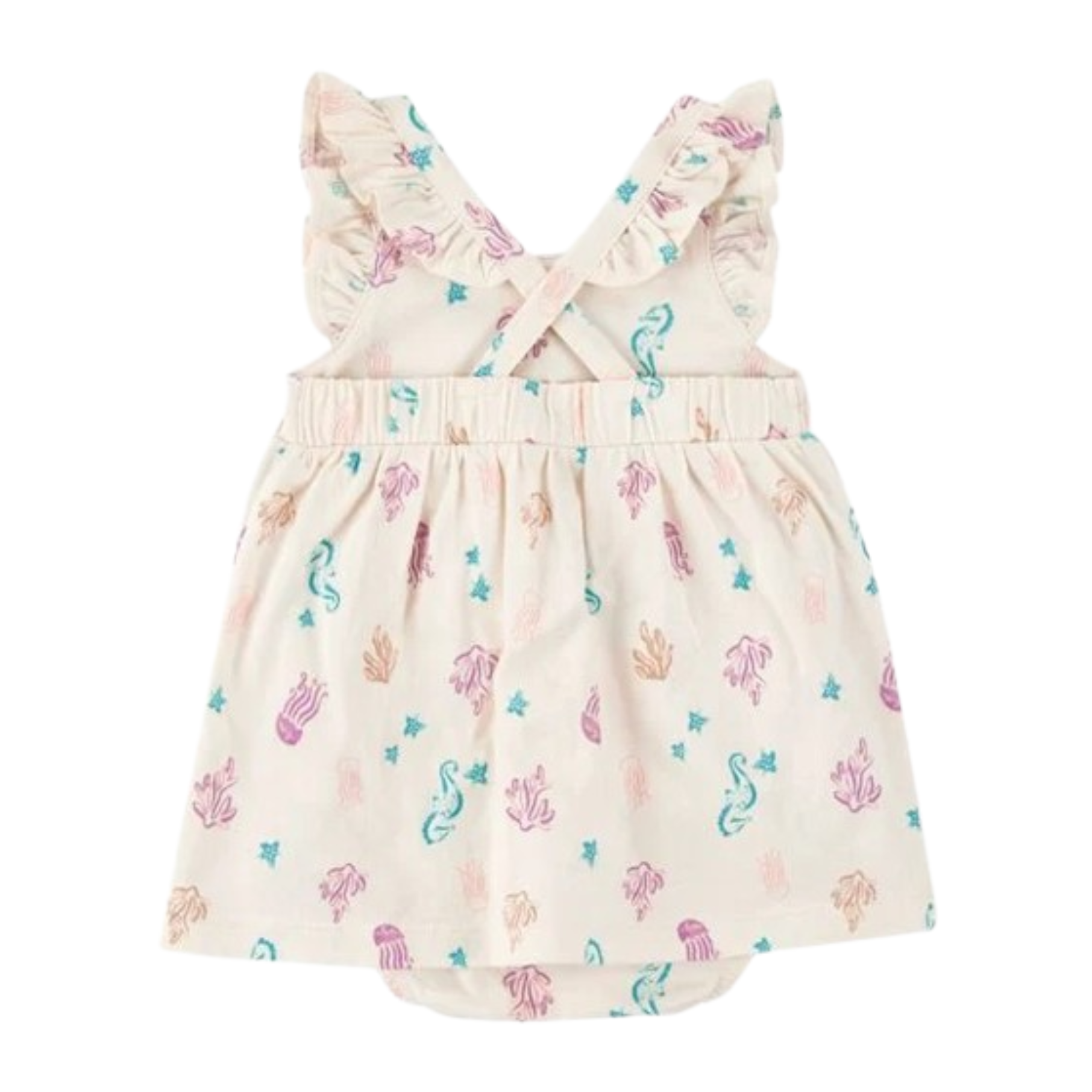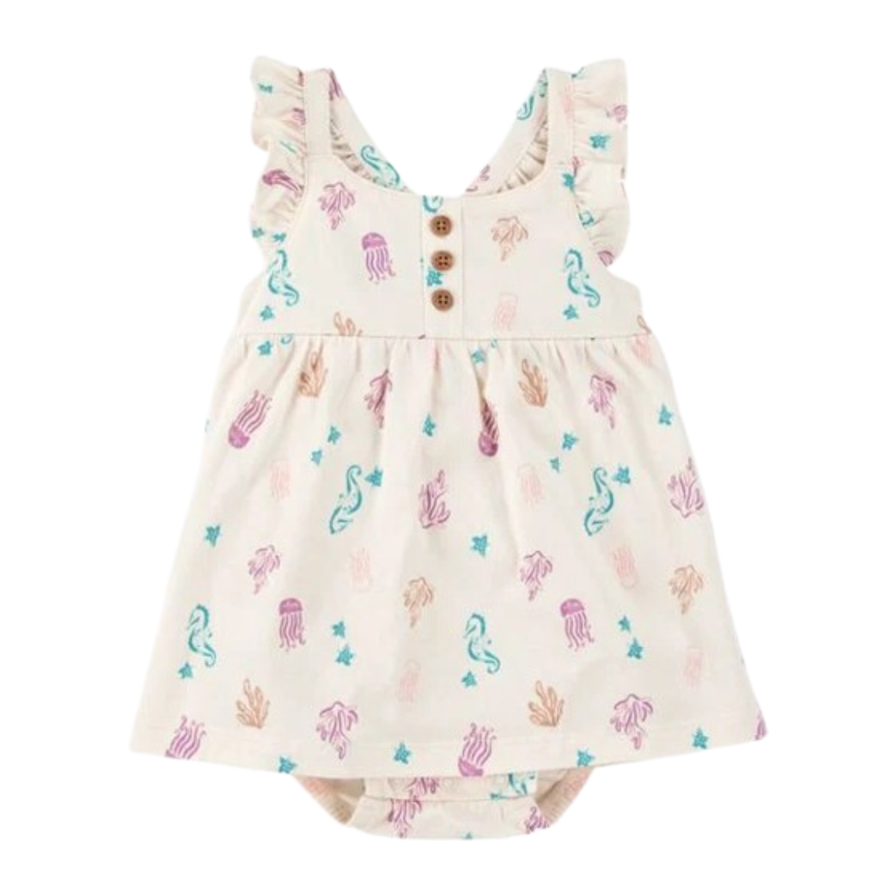 Diseñado en algodón suave con un vestido estampado de mar en el exterior y un body incorporado en el interior, ¡este traje de sol hace que el bebé se vista en un abrir y cerrar de ojos!