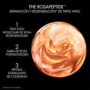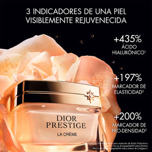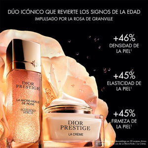 Resultado de la combinación entre la especialización floral y la experiencia biológica de la Maison, Dior Prestige La Crème está enriquecida con el nuevo Rosapeptide: un concentrado de regeneración que combina un extracto con 88 moléculas de Rosa de Granville, su savia vital y dos péptidos amplificadores de la expresión del colágeno. Compuesta por un 92 %* de ingredientes de origen natural, la fórmula de esta crema con efecto rejuvenecedor ayuda a reconstruir la estructura y las funciones de la piel, para contribuir a redensificarla y reforzarla.