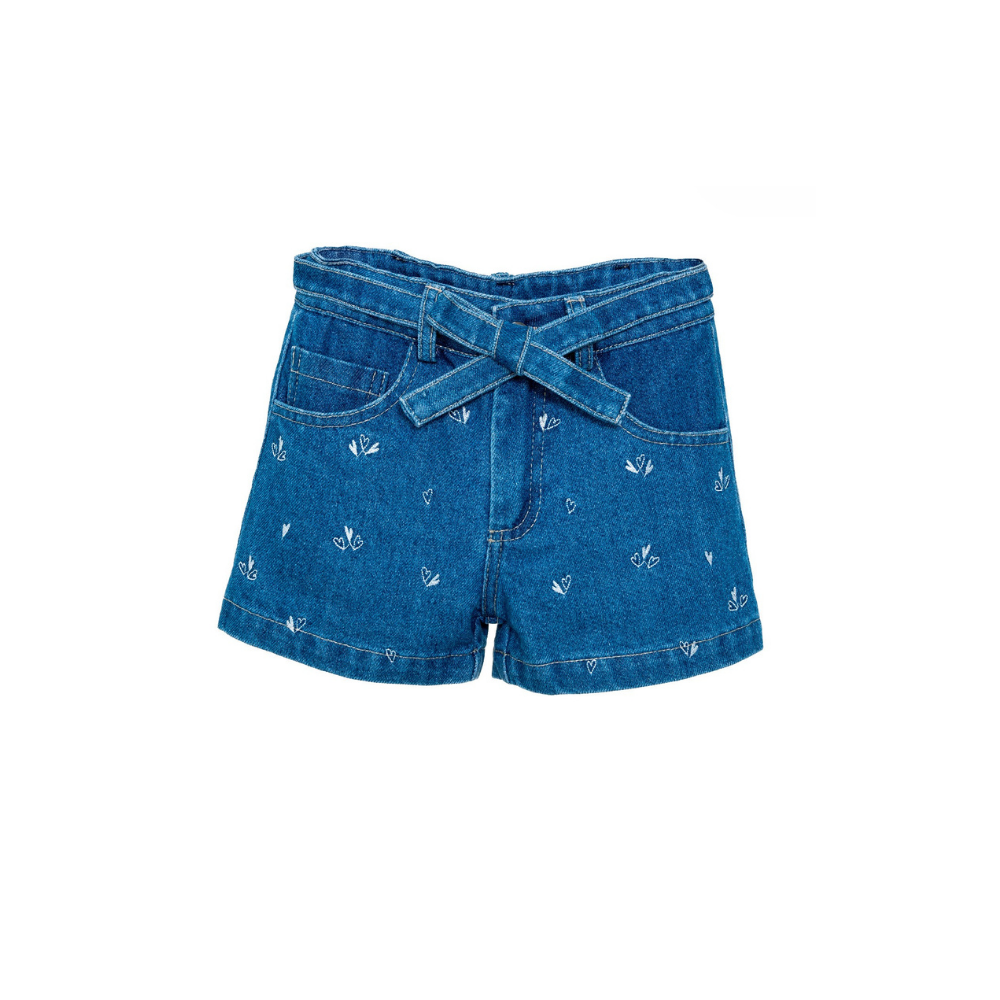 Short en tejido plano, rebordado con corazones y fajon en la cintura de la misma tela.