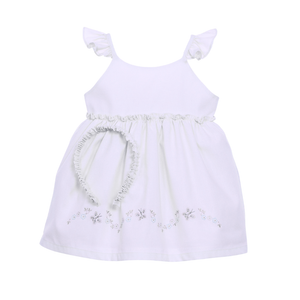 Vestido en tejido plano, bordado en falda y una diadema al tono que acompaña perfectamente.