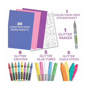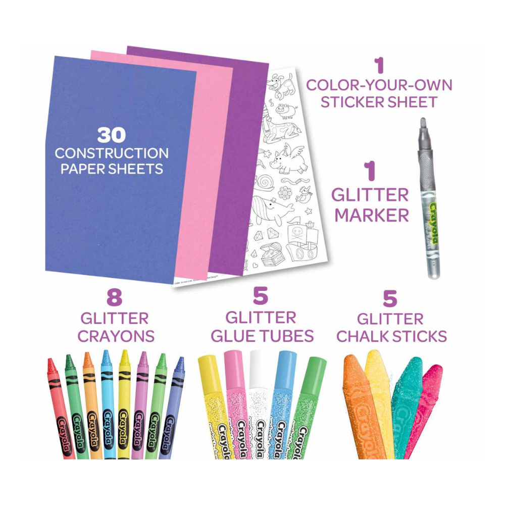 El Estuche de Arte "Todo lo que Brilla" incluye todo lo necesario para que tus obras de arte deslumbren. Este deslumbrante set incluye crayones brillantes Crayola con brillantina, pegamentos, marcadores y tizas, además de hojas de cartulina, una hoja de pegatinas para colorear y un resistente estuche. Diseñado para artistas a partir de cinco años, el kit está repleto de herramientas brillantes que puedes usar para añadir brillo y color a una variedad de materiales.