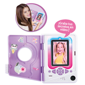 El Diario Secreto en Vídeo es un diario electrónico diseñado para que los niños graben vídeos, tomen fotos y se expresen creativamente. Incluye un sistema seguro de desbloqueo por huella dactilar, luces LED ambientales y varios filtros y marcos para personalizar las entradas.