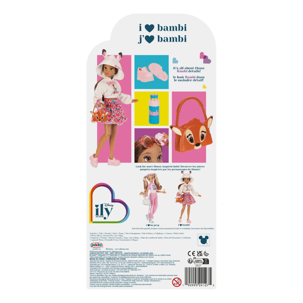 Esta muñeca de moda Disney illy 4EVER Fashion, inspirada en la Bambi de Disney, es el tipo de amiga que está cerca y "cierva" para tu corazón! Su falda floral es tan bonita como un prado en un día soleado, y te encantarás con su sudadera suave y acogedora con orejas encima. Un bolso inspirado en Bambi, gafas de sol con forma de flor y unos zapatos rosas gruesos completan su adorable look. Cuando sale a hacer un poco de turismo, hacer una excursión al lugar escénico perfecto es fácil con su móvil práctico, cámara y botella de agua. ¡Un álbum de fotos para guardar sus dos fotos instantáneas favoritas!