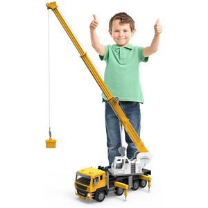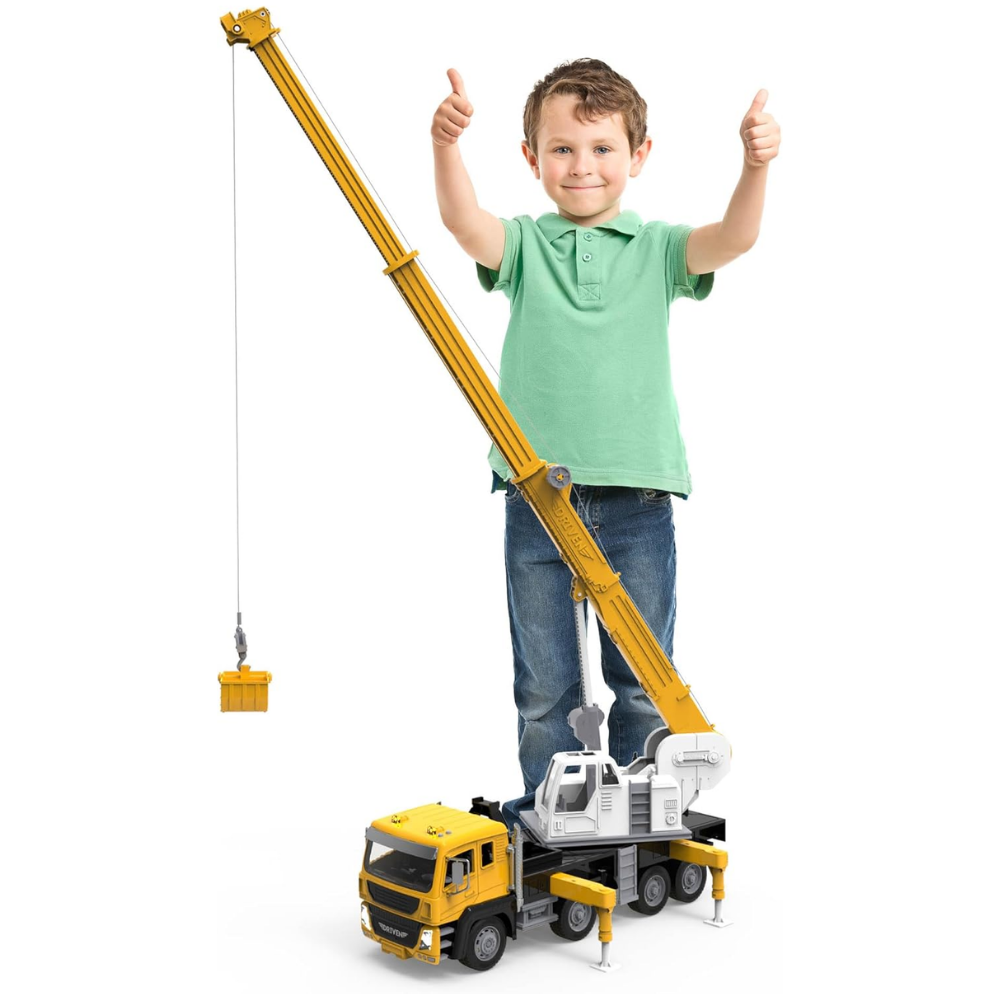 • Camión Grúa de Juguete: ¡ Grúa gigante de juguete estilo europeo con brazo extensible y un divertido sistema de poleas que se eleva y gira en cualquier dirección! Incluye 4 conos de tráfico de juguete, luces intermitentes, sonidos realistas y piezas móviles.
