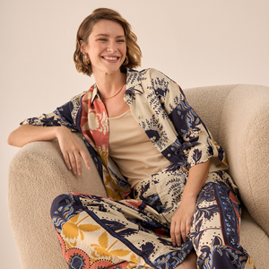 Camisa multicolor con estampado patchwork que combina motivos florales, geométricos y puntos en una composición artística única. Su tejido fluido de viscosa y nylon ofrece comodidad durante todo el día, mientras que el cuello camisero estructurado y los botones nacarados añaden sofisticación. Perfecta para expresar tu personalidad creativa en reuniones de trabajo, eventos sociales o brunches con amigas.