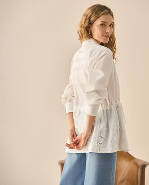 Una prenda que combina estructura y feminidad. Esta camisa de manga larga, con cuello clásico y canal con tiras ajustables en la cintura, se adapta con gracia a tu silueta. El bordado tono a tono con detalles desagujados en el bajo revela ese encanto que distingue a Esprit.