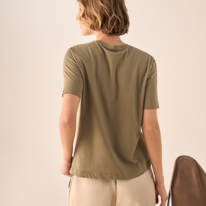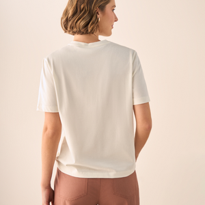 Esta camiseta destaca por su bordado floral que añade sofisticación a cualquier look casual. El diseño artesanal con hilos dorados crea un punto focal elegante, mientras que el algodón premium garantiza comodidad durante todo el día. Su corte regular se adapta naturalmente a diferentes siluetas, convirtiéndola en una opción versátil para múltiples ocasiones desde reuniones informales hasta salidas de fin de semana.
