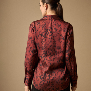 Camisa naranja terracota con estampado animal print orgánico que aporta personalidad sin esfuerzo. Su tejido fluido de poliéster premium garantiza comodidad durante todo el día, mientras que el corte regular se adapta a diferentes siluetas con elegancia natural. Los botones tono sobre tono y el cuello camisero estructurado completan un diseño que transiciona fácilmente de reuniones matutinas a cenas nocturnas.