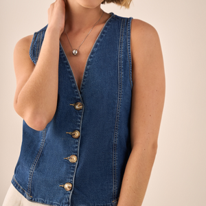 Chaleco denim azul medio con escote V profundo y botones de madera natural que aporta estructura sin peso. Sus costuras contrastantes en amarillo añaden personalidad mientras que el corte ajustado realza la silueta de forma natural. Perfecto para crear capas sofisticadas en cualquier temporada, desde looks casuales hasta conjuntos más elaborados para la oficina.