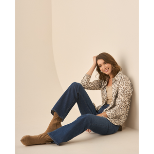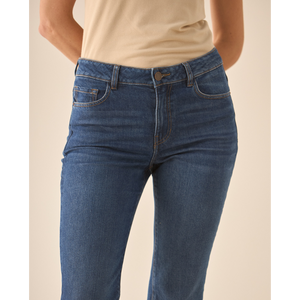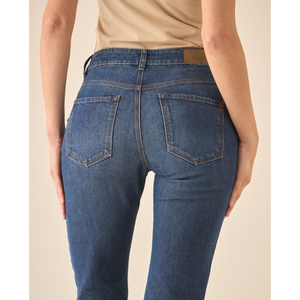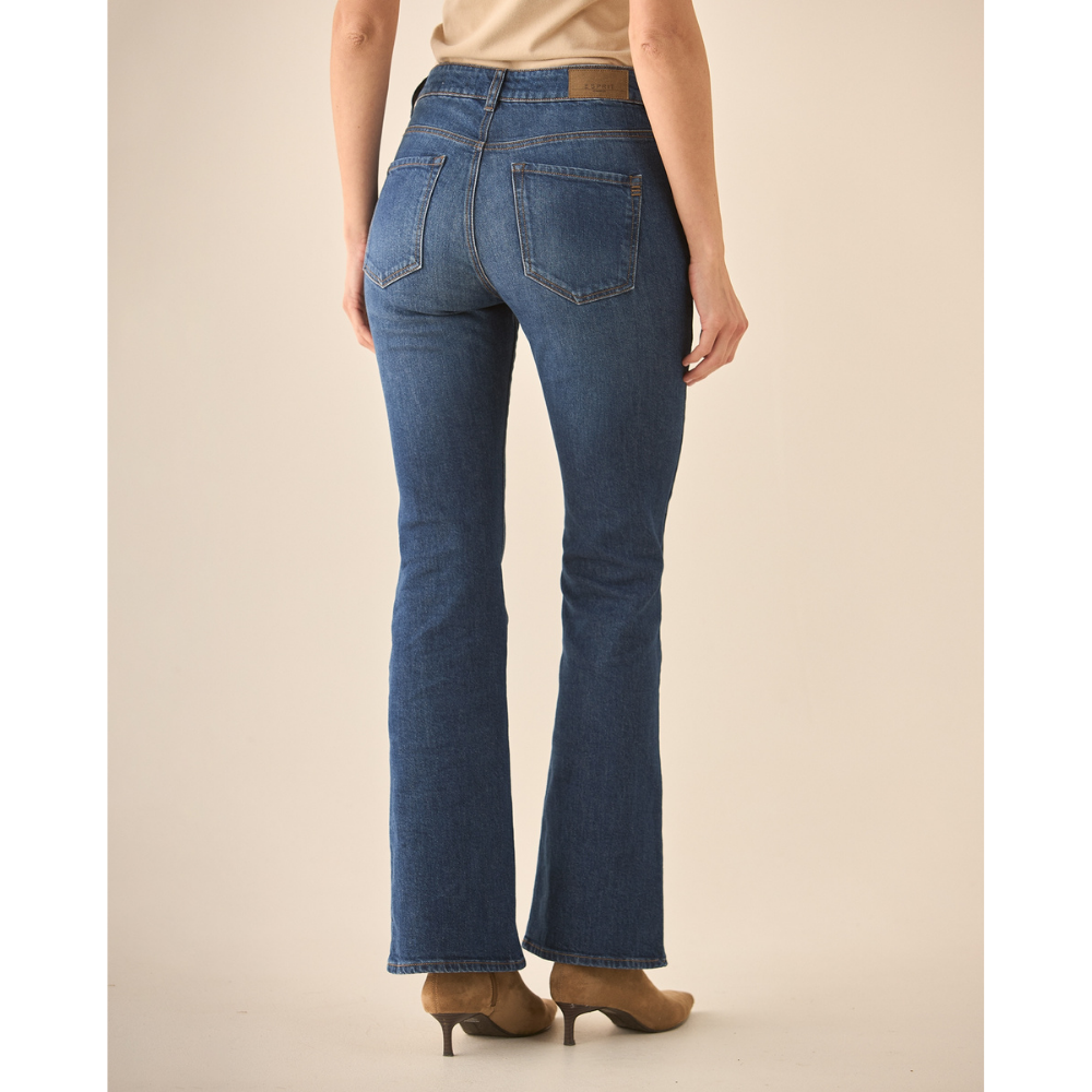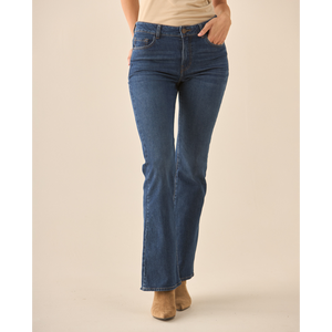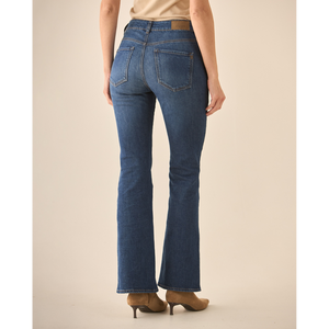 Con silueta entallada en la cadera y un sutil vuelo desde la rodilla, este jean boot cut en tono medio oscuro que estiliza con naturalidad. Los bigotes y arrugas 3D aportan profundidad, mientras su estructura de cinco bolsillos y cierre clásico lo convierten en un básico moderno. Lúcelo con un blazer para un momento formal o con una camisa tejida en días casuales.