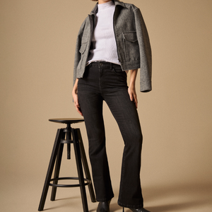 Jean negro de silueta flared con tiro alto que se ensancha desde la rodilla, creando una línea alargada y favorecedora. Su composición con elastano aporta comodidad sin comprometer la estructura del denim, mientras que el lavado ultraoscuro mantiene su intensidad. Ideal para quienes buscan un básico con personalidad que funciona desde looks casuales hasta semi-formales.