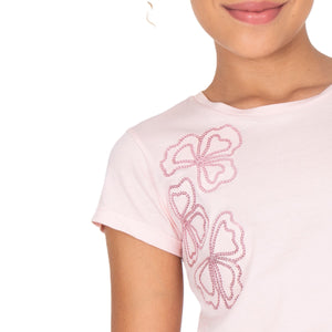 Camiseta básica de algodón suave para niña, con un delicado bordado de flores en lentejuelas que añade un toque brillante y alegre.