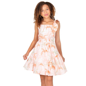 Vestido de algodón para niña, confeccionado en tela con estampado floral y un volante asimétrico que aporta movimiento y alegría.