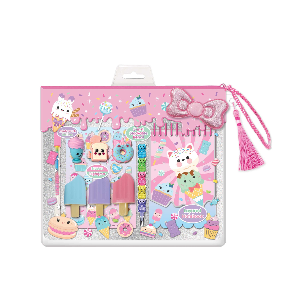Organiza tus útiles escolares con estilo y alegría. Este set incluye un estuche tipo caboodle con diseño dulce, 2 bandejas desplegables y todo lo necesario para escribir y dibujar: libreta, 2 lápices, sacapuntas, regla, borrador en forma de puzzle, 2 bolígrafos de gel con topper 3D, 3 resaltadores y 3 láminas de stickers. Con su diseño atractivo y funcional, es ideal para niñas entre 4 a 8 años.