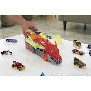 El Transportador de Lanzamiento de Dragón de Hot Wheels City ofrece diversión ardiente con características supergeniales que les encantarán a los niños. En lugar de lanzar llamas de su boca, ¡este elegante dragón dispara vehículos Hot Wheels! Los niños podrán cargar tres vehículos y luego presionar el lanzador para enviar a los vehículos a toda velocidad a diferentes aventuras. Los conectores de pista en la parte delantera y trasera de la bestia les permiten a los niños enganchar pistas Hot Wheels® para conectar el set a un edificio existente o construir uno nuevo. Este camión de transporte viene con un vehículo Hot Wheels, pero puede almacenar hasta cinco. No compatible con todos vehículos Hot Wheels. Los vehículos adicionales se venden por separado