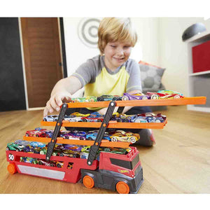 El Megarremolque Hot Wheels es una gran plataforma para grandes aventuras con infinitas posibilidades para crear historias. Este transportador de gran tamaño puede cargarse con hasta 50 vehículos en sus 6 niveles expandibles, ¡y esto es solo el principio! En la parte posterior del transportador, hay una rampa que desciende para conectarse a sets de Hot Wheels City. La cabina de la plataforma se abre con espacio suficiente para estacionar 2 vehículos más, y el increíble panel lateral transparente se abre para que los niños puedan guardar sus vehículos favoritos en un lugar especial. Conecta el Megarremolque a la pista de color naranja HotWheels y coloca los vehículos uno junto a otro en la pista de carrerastradicional para jugar.