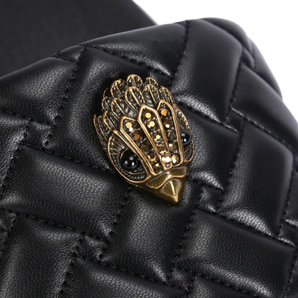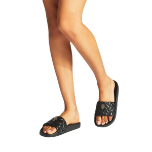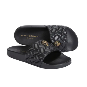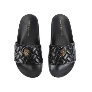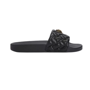 La sandalia Meena Eagle llega en un estilo negro tipo slide. La correa está acolchonada y rematada con una cabeza de águila en latón envejecido. Material: Textil. Plantilla moldeada.