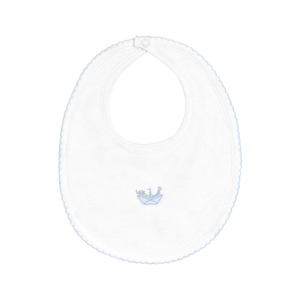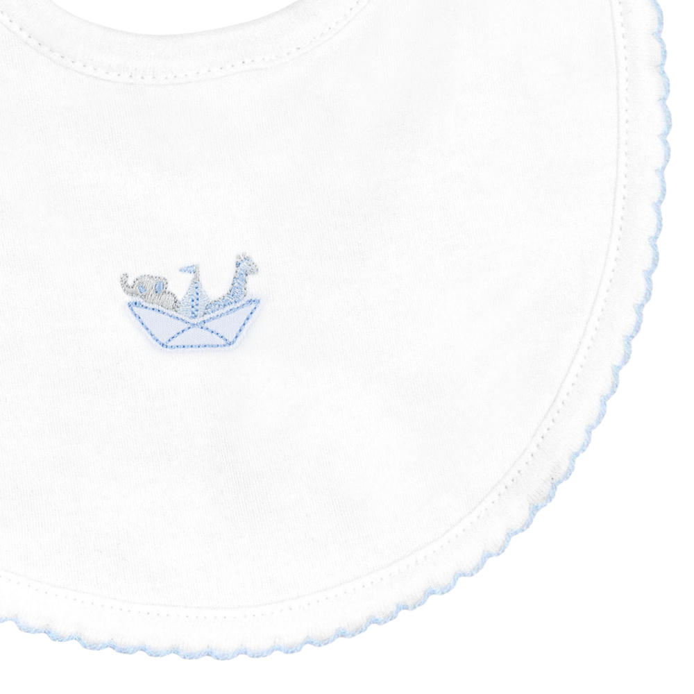Este encantador babero de algodón Pima peruano está pensado para acompañar los primeros momentos del bebé con suavidad y estilo. Su tejido es hipoalergénico, absorbente y extremadamente delicado con la piel, ideal para el uso diario. El diseño combina elegancia y funcionalidad: tiene bordes celeste, un broche blanco en el cuello para un ajuste cómodo, y un adorable bordado de un barquito con una jirafa y un elefantito.