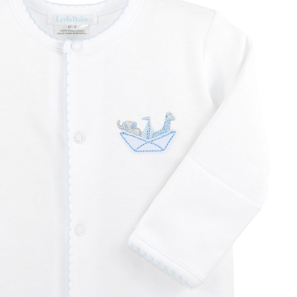 Elaborado con 100 % algodón Pima peruano, este enterizo ofrece suavidad, frescura y comodidad ideales para la piel delicada de tu bebé. Su diseño destaca por el bordado de un barquito con una jirafa y un elefante, y los detalles en en cuello, mangas y broches, que añaden un toque encantador.