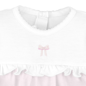 El diseño combina elegancia y funcionalidad: tiene un lazito rosado bordado, broches en la espalda y en las piernas para un ajuste cómodo.