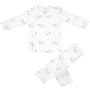 Elaborado con 100 % algodón Pima peruano, este set de dos piezas ofrece suavidad, frescura y comodidad ideales para la piel delicada de tu bebé. Su diseño destaca por el estampado de un barquito con una jirafa y un elefante, y los detalles celestes en el cuello, mangas y broches, que añaden un toque encantador.