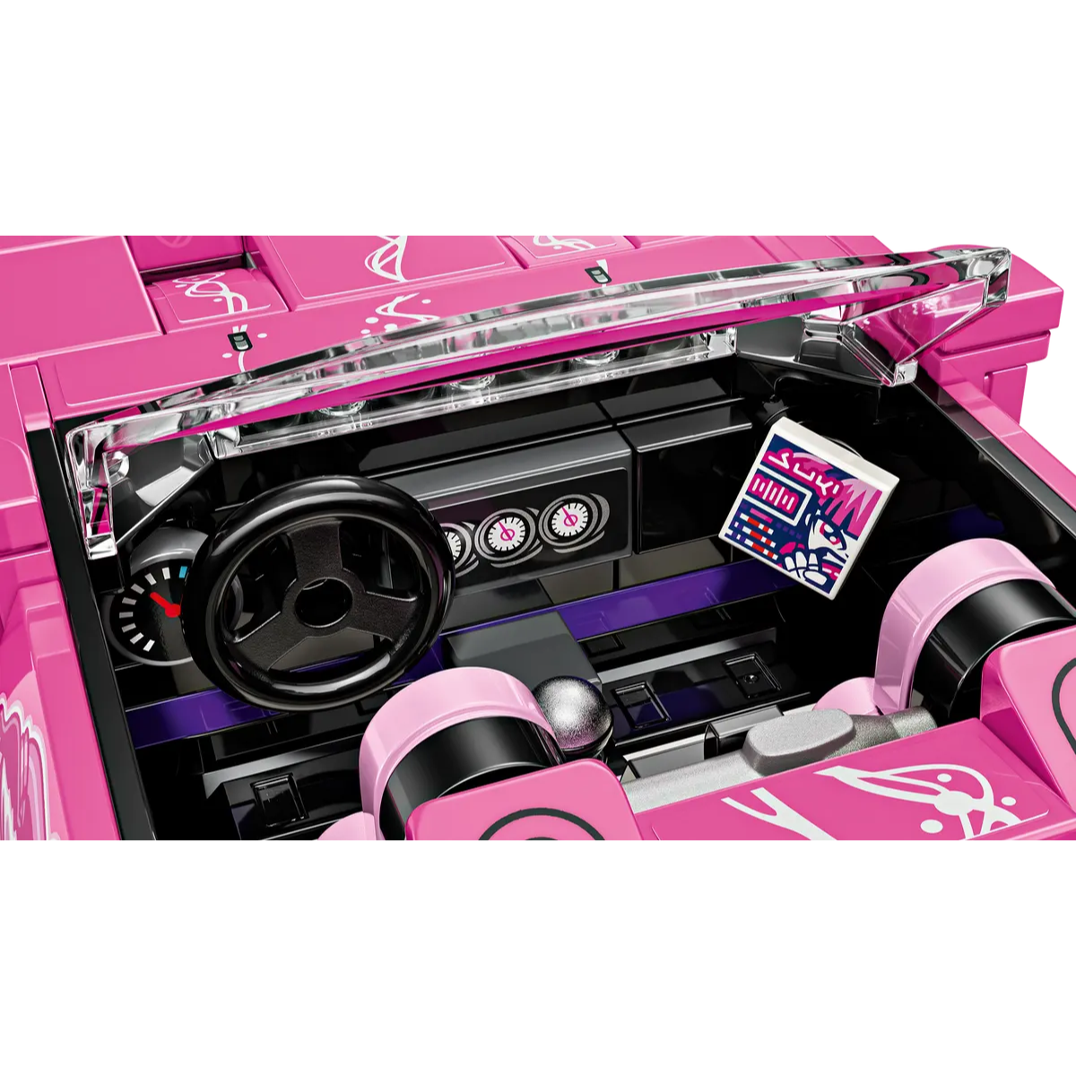 Este auto de LEGO está repleto de características realistas: incluye monitor interior, alerón trasero, parrilla delantera, faros, llantas y los gráficos estilo anime característicos en el capó, los costados y la parte trasera. Además, viene con una minifigura de Suki, que se puede colocar al volante para simular increíbles carreras callejeras.