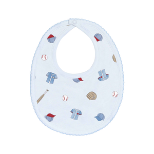 Este babero celeste con estampado de béisbol combina funcionalidad y encanto artesanal. Confeccionado en algodón Pima peruano ultra suave, cuida la delicada piel del bebé mientras lo mantiene limpio durante las comidas.