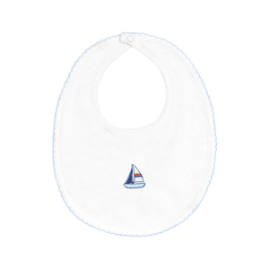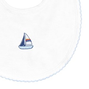 Este babero de algodón Pima peruano es ideal para los primeros meses de tu bebé, combinando funcionalidad y estilo. Su borde en crochet celeste añade un toque artesanal y elegante, mientras que el bordado de un pequeño bote en el centro del pecho crea un diseño encantador y único.