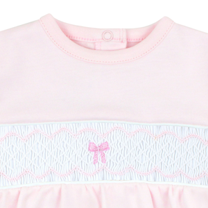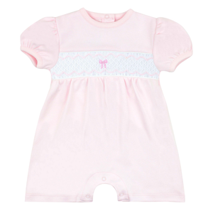 Enterizo corto rosado con bordado smock y un lazo bordado a mano es una prenda encantadora y delicada, perfecta para acompañar los días más dulces de tu bebé. Confeccionado en algodón Pima peruano, su textura ultrasuave cuida la piel sensible, ofreciendo frescura y comodidad durante todo el día.