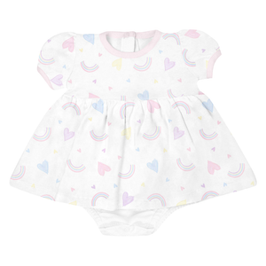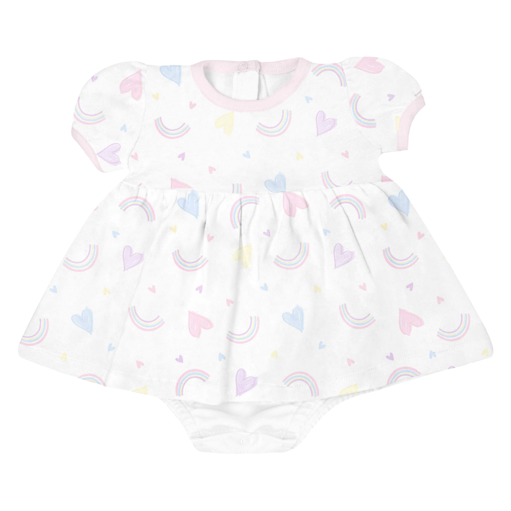 Este vestido es una sola pieza con un body interno, combina la delicadeza del diseño con la comodidad ideal para los primeros años. Hecho con algodón Pima peruano, su suavidad cuida la piel sensible del bebé mientras el estampado de corazones y arcoíris llena la prenda de alegría.