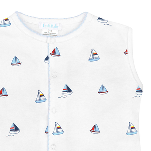 El estampado de pequeños botes a lo largo de todo el romper le da un toque náutico único, mientras que los detalles en crochet celeste en el cuello y los broches añaden un acabado artesanal y elegante. Este romper es ideal para mantener a tu bebé cómodo y con estilo en sus primeros meses.