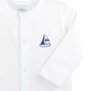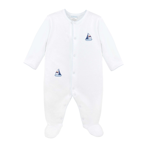 Este enterizo blanco de algodón Pima peruano es el epítome de la suavidad y la comodidad para tu bebé. Su borde en crochet, en mangas, cuello y broches, le da un toque delicado y elegante que resalta su diseño atemporal. En el pecho del lado izquierdo y en la pierna derecha, encontrarás un bordado encantador de un bote pequeño, en tonos celestes, con dos velas, una azul y una blanca, con rayas rojas y azules, evocando la frescura y tranquilidad del mar.