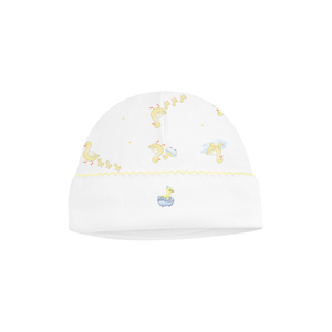 Completa el look más tierno con nuestro gorrito “Bath Time”, confeccionado en suave y delicado algodón Pima peruano, reconocido por su suavidad y resistencia natural. Su estampado presenta adorables patitos bañándose, símbolo de ternura y pureza, mientras que en la pretina blanca destaca un bordado central de una mamá pato con su patito en la bañera, aportando un detalle encantador y único.