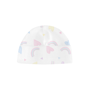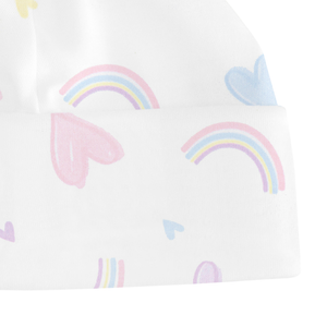 Este adorable gorro para bebé niña está confeccionado con el más suave algodón Pima peruano, ideal para mantener su cabecita abrigada y cómoda. Su encantador estampado de corazones y arcoíris aporta un toque alegre y tierno a cualquier conjunto, combinando perfectamente con el resto de la colección Hearts & Rainbows.