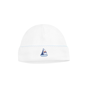 Este adorable gorro para bebé niño, elaborado en algodón Pima peruano, combina suavidad, elegancia y calidez. Su diseño en color blanco destaca por el borde tejido en crochet celeste y el delicado bordado de un pequeño bote en el frente, que aporta un toque náutico encantador y combina a la perfección con el resto de la colección.