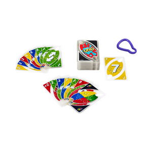 UNO es el juego que puedes jugar en cualquier momento, con cualquier persona, y ahora es aún más fácil de jugar en cualquier lugar. Las tarjetas de plástico duraderas resisten el agua para que puedas disfrutar jugando en cualquier lugar, incluso al aire libre. Esta versión también viene con un práctico clip que mantiene todas las tarjetas juntas y se conecta a una bolsa de playa, mochila o equipo de campamento. Juega haciendo coincidir el color o el número, o juega una carta de acción contra tu oponente. Gana puntos al ser el primero en deshacerte de todas las cartas de la mano. Contiene 108 tarjetas. Juega UNO donde quieras, y no olvides: cuando solo te quede una carta, grita "¡UNO!"