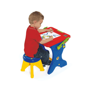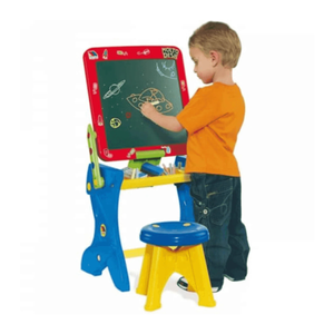 Pupitre y pizarra, 2 en 1. Al levantar el tablero es una pizarra, al bajarlo un pupitre de gran estabilidad con tamburete. Incluye 10 tizas de colores, lápiz, sacapuntas, borrador y esponja. Ideal para peqeus de 3 a 6 años. ADVERTENCIA: No recomendable para menores de 3 años, ya que contiene piezas pequeñas que podrían provocar asfixia en caso de ser ingeridas por el niño/a.