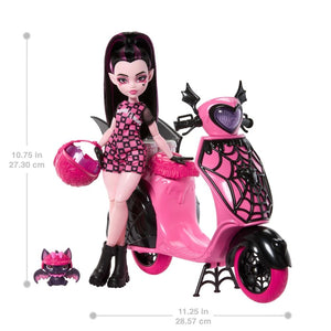 El reloj ha dado la medianoche en Monster High, y Draculaura está lista para la aventura con su vampírico scooter y su adorable murciélago mascota, el Conde Fabuloso. ¡Incluso tienen cascos a juego! El set viene con aterradores detalles como ruedas móviles, un soporte y una canasta especial para que el Conde Fabuloso pueda viajar. Es un excelente regalo para niños de 4 años en adelante. La muñeca no se puede mantener de pie por sí sola. Los colores y las decoraciones pueden variar.
