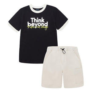 Conjunto de camiseta manga corta en tejido de punto + bermuda en tejido plano con cordón ajustable y cintura con elástico. Perfecto para días de juego y aventuras. ¡Comodidad y estilo en uno!