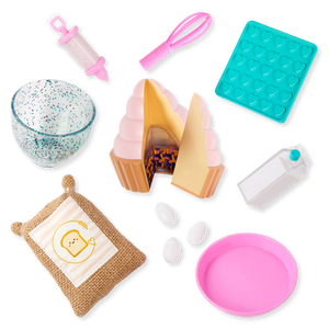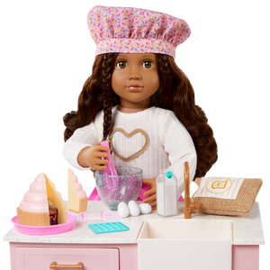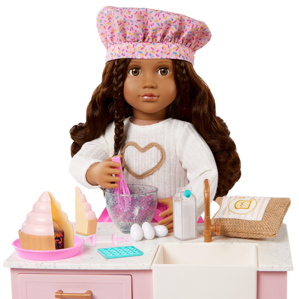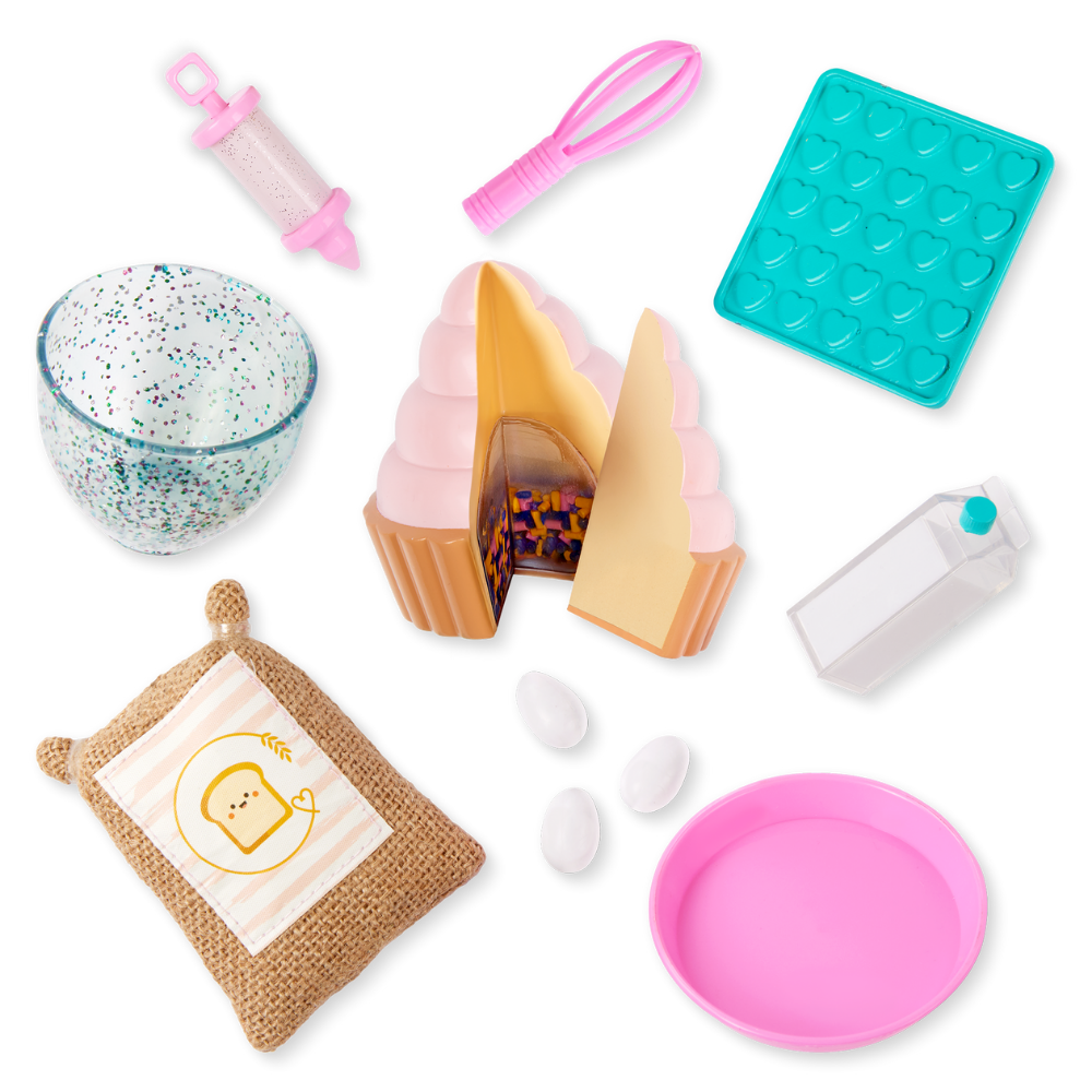 Incluye: Muñeca articulada, suéter, par de pantalones, par de ropa interior, zapatos, gorro de chef, delantal, cupcake con rebanada removible, agarradera, jeringa para manga pastelera, tazón para mezclar, batidor, bolsa de harina, cartón de leche, 3 huevos, molde para pastel, libro de cuentos y marcador.