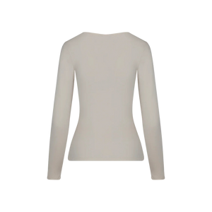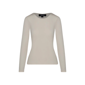 Blusa Hana Perla. Una prenda atemporal y versátil, confeccionada en tejido ligero que se ajusta suavemente a la silueta, con cuello redondo y manga larga, la convierte en un esencial de armario que podrás combinar fácilmente en looks casuales. Elaborada en 87% Poliamida y 13% elastano.