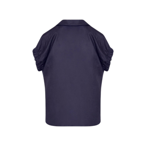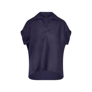 Blusa Janine azul navy. Tiene cuello tipo camisa, escote en “V” y mangas cortas con detalle de recogido, lo que le da un toque relajado y sofisticado a la vez. Su ruedo más largo en la parte trasera estiliza la silueta y la hace perfecta para usar por dentro o por fuera. Material 100% lino.