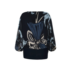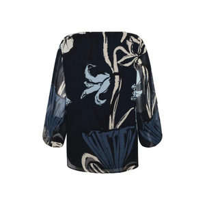 Blusa Julia azul navy, mangas largas, con corte asimétrico más largo en la párte posterior. Material en 100% Viscosa