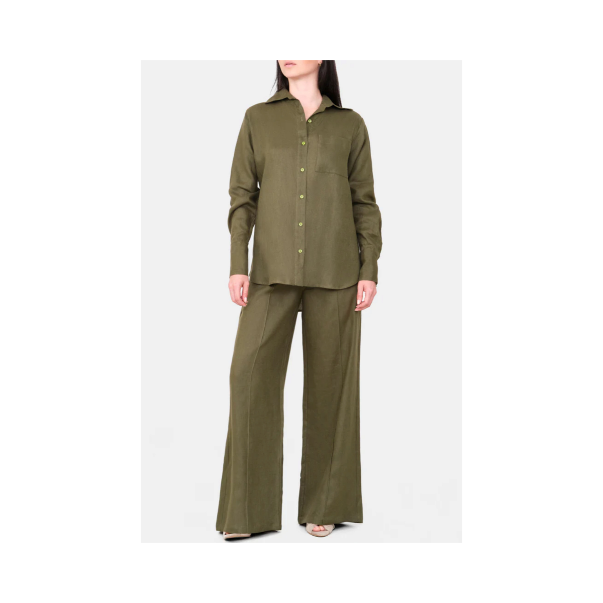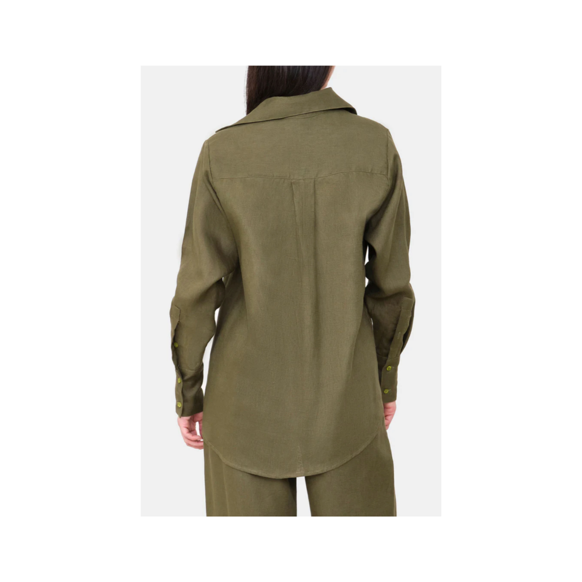 Camisa new giorgina verde oliva, estilo camisera over size, con botones en las  mangas y bolsillo en la parte delantera. Fit oversize. Elaborada en 100% Lino, lo cual permite tener una prenda fresca y versátil.